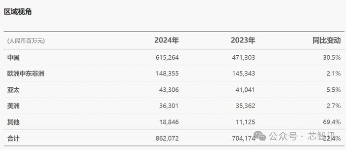 从区域营收来源来看,华为2024年中国区营收为6152.64亿元,同比增长30.5%,在总营收当中占比高达71.37%;欧洲中东非洲地区的营收为1483.55亿元,同比增长2.1%;亚太地区营收为433.06亿元,同比增长5.5%;美洲地区营收为363.01亿元,同比增长2.7%。
