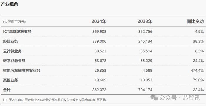 从具体业务表现来看,2024年,华为ICT基础设施业务实现销售收入3699.03亿元,同比增长4.9%;终端业务实现销售收入3390.06亿元,同比增长38.3%;云计算业务实现销售收入385.23亿元,同比增长8.5%;数字能源业务实现销售收入686.78亿元,同比增长24.4%;智能汽车解决方案业务实现销售收入263.53亿元,同比暴涨474.4%。
