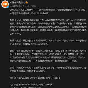 2025年3月29日22时44分,一辆小米SU7标准版在德上高速公路池祁段行驶过程中遭遇严重交通事故。小米公司对此深感痛惜。