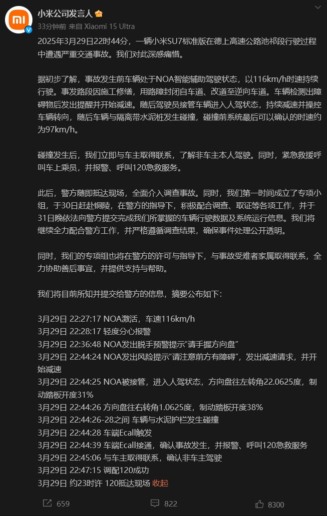 4月1日,微博@小米公司发言人 就近日安徽发生的一起小米SU7事故发文: