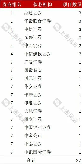 保荐机构按照项目数量排名前三的是:海通证券、华泰联合证券、中信证券以3家项目并列排名第一。
