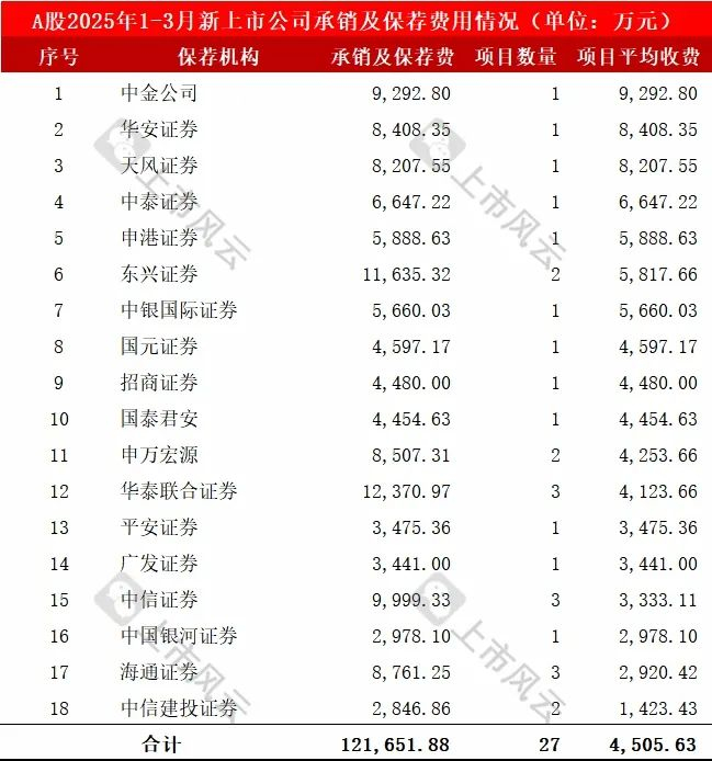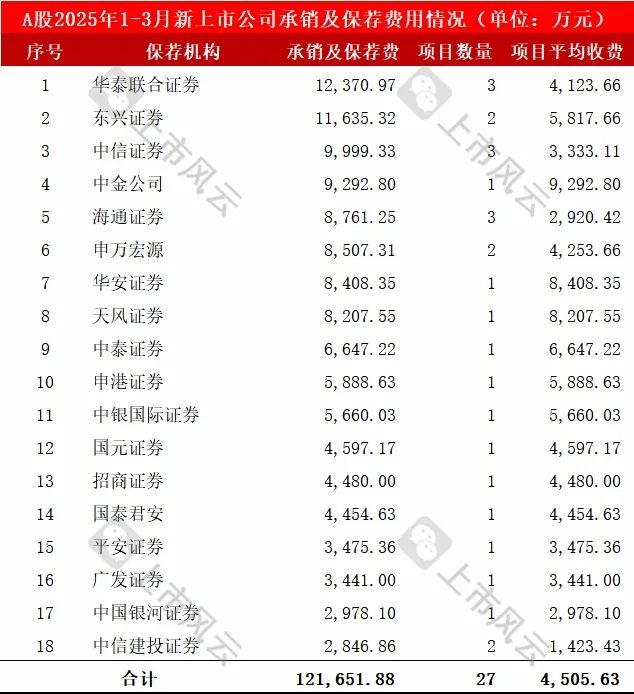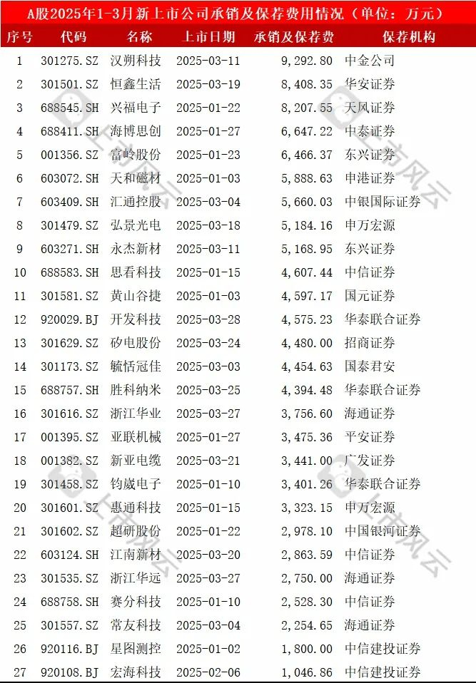 2025年1-3月,27家A股新上市公司的IPO保荐机构、承销及保荐费用详细如下: