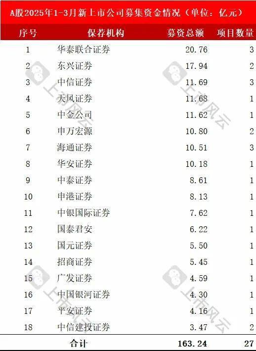 2025年1-3月共有18家保荐机构为27家新上市公司IPO提供上市保荐服务。
