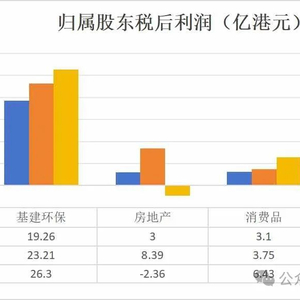 2024 年收入结构有所变化,该公司基建环保收入 102.63 亿港元,同比保持稳定,收入份额提升 3.7 个百分点至 35.5%;房地产业务收入 151.52 亿港元,受行业影响下滑,收入份额下降至 52.4%,而消费品业务收入 35.03 亿港元,逆势增长 9.4%,收入份额提升 2.3 个百分点至 12.1%。此外,大健康业务通过参股方式布局,只并表利润。