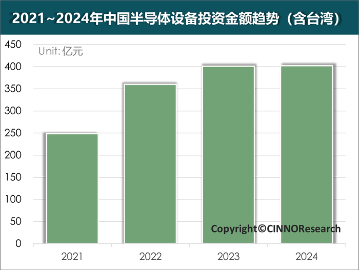 2021~2024年中国半导体设备投资金额趋势(含台湾) 来源:CINNO Research