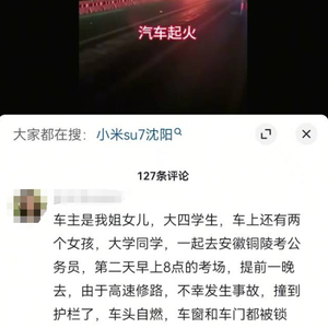 4月1日,网络流传一组视频及图片显示,安徽一新能源车撞上高速公路中间护栏起火燃烧,有目击者声称小米SU7车上3人已去世。