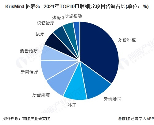 2024年口腔咨询中牙齿种植和牙齿矫正的占比相对较高。牙齿种植和矫正可以帮助人们解决牙齿缺失和畸形问题,改善口腔功能和外貌形象,受到广泛青睐。