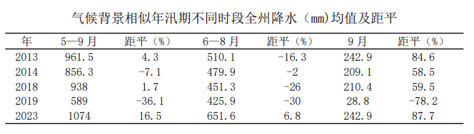 相似年分析。综合前期气候状况和气候因子,汛期相似年有2013年、2014年、2018年、2019年和2023年。相似年份主要特点:一是主汛期降水偏少,降水集中期不明显,但有局地性暴雨洪涝;二是盛夏有阶段性高温,强对流天气多发;三是9月秋汛明显。具体见下表。