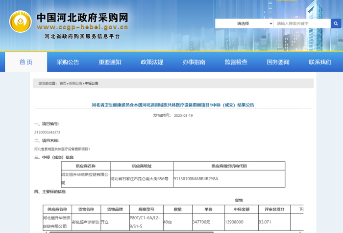 河北省卫生健康委员会(以下简称“河北卫健委”)于2025年3月19日公布了超声设备集中采购项目的中标结果。此次集采项目总计采购79套超声设备,预算金额为9480万元,国内超声龙头开立医疗及国际巨头GE医疗中标,总计中标金额约3099万,此次集中采购共实现预算节省6381万。