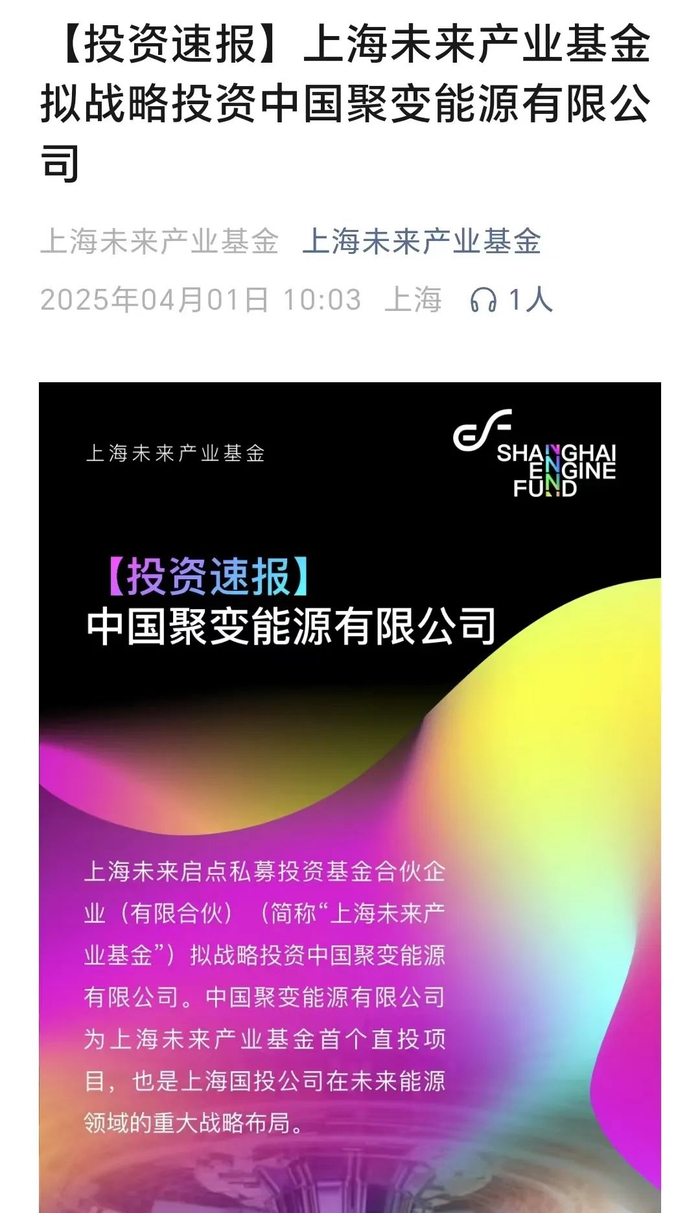 4月1日,上海未来产业基金官微发布“投资速报”,上海未来产业基金拟战略投资中国聚变能源有限公司,该项目是上海未来产业基金首个直投项目,也是上海国投公司在未来能源领域的重大战略布局。