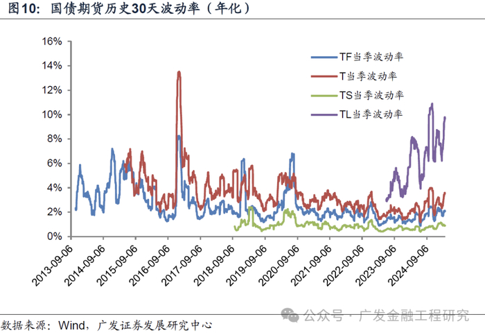 以下是自上市以来,TF、T、TS、TL国债期货的历史30天波动率(年化),一季度国债期货整体波动率处于较高水平。