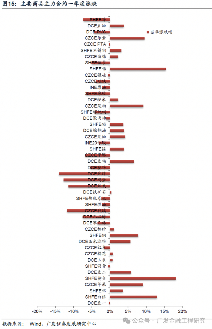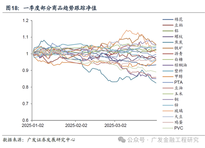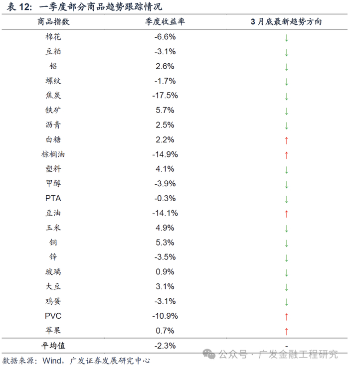 一季度商品趋势跟踪策略在主要品种上平均收益-2.3%,价格趋势策略收益不理想,业绩较好的品种是铁矿和铜。
