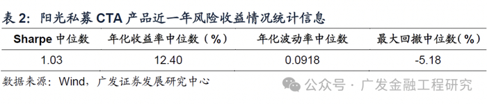 从近一年风险收益情况来看,一季度公布数据的CTA产品样本数量46只(剔除6个月没有净值的产品),年化收益率中位数为12.40%,Sharpe Ratio中位数为1.03,近一年最大回撤率中位数为-5.18%,如下表。