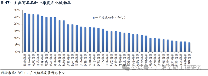 一季度波动率最高的三个品种分别为锰硅、菜粕、玻璃;波动率最低的三个品种分别为聚丙烯、棉花、玉米。