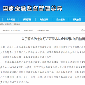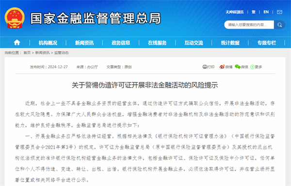 为保障广大人民群众合法权益,增强金融消费者对非法金融机构及非法金融活动的防范意识和识别能力,维护良好金融秩序,2024年1月,国家金融监督管理总局深圳监管局发布了《关于伪造、转让<金融许可证>等非法活动的风险提示》。2024年底,国家金融监督管理总局也发布了相关风险提示。