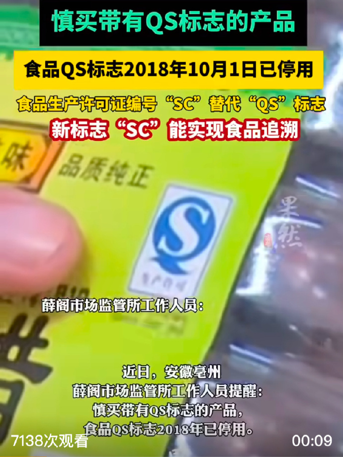 据报道,近日,安徽亳州市场监管部门发出消费提醒:消费者在选购食品时应避免购买带有QS标志的产品。这一提醒源于我国食品标识制度的重大变革——自2018年10月1日起,QS标志已全面停止使用。