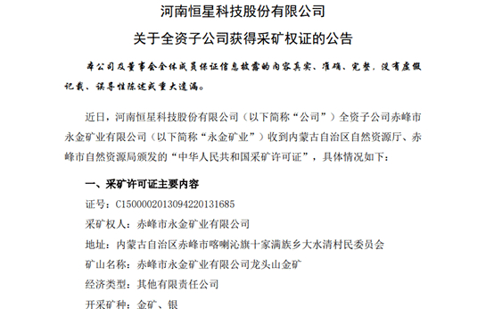消息面上,3月27日晚间,恒星科技公告称,近日,其全资子公司赤峰市永金矿业有限公司(以下简称“永金矿业”)收到内蒙古自治区自然资源厅、赤峰市自然资源局颁发的“中华人民共和国采矿许可证”。