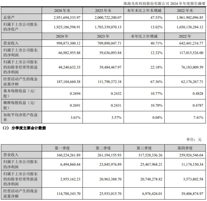 3月30日,光库科技发布2024年度报告,公司全年实现营业收入9.99亿元,同比增长40.7%;归母净利润6698万元,同比增长12.3%。
