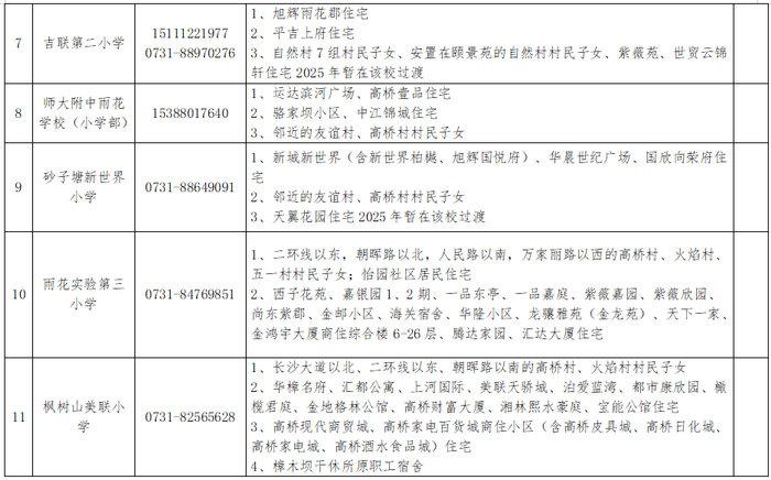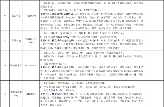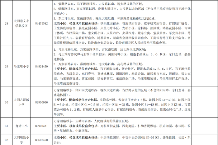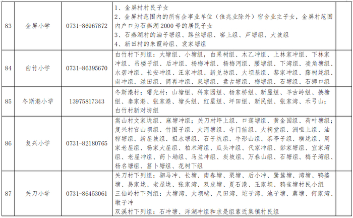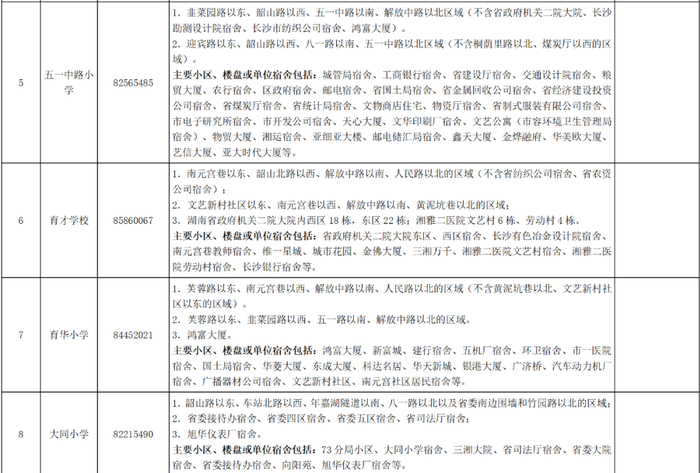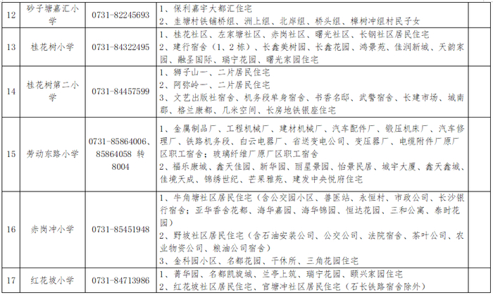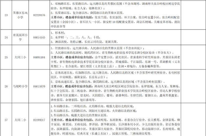 五、对芙蓉区公办小学学区划分及入学政策有疑问的,请咨询芙蓉区教育局基础教育科(84683247)及各学校(咨询电话见下表)。