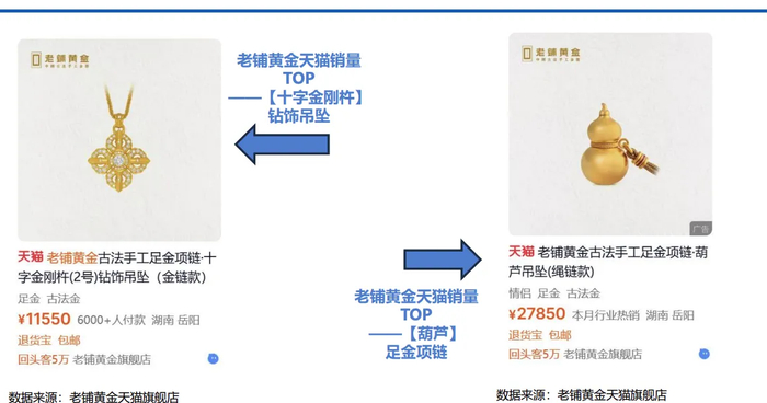 在这一背景下,当前老铺黄金如“十字金刚杵”、“葫芦吊坠”等旺销产品具备很浓厚的收藏产品色彩,也进一步支撑了其高溢价的定价策略。