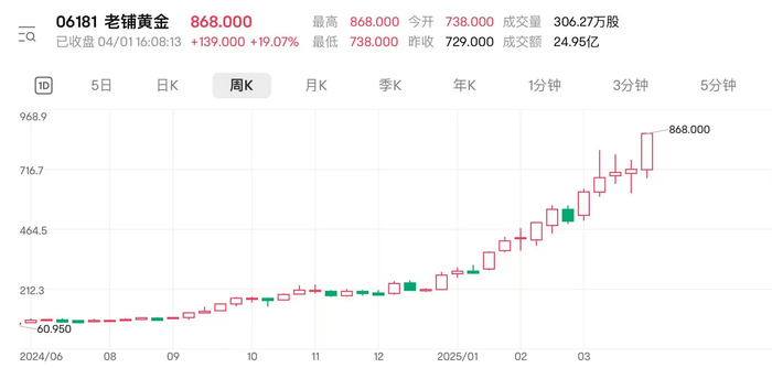 回到资本市场上,截至4月1日收盘,老铺黄金股价已飙至868港元/股的历史高位,滚动市盈率估值高达91.87倍。
