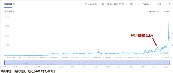 东吴证券表示,以百度搜索指数作为参考,在2015-2023年,老铺黄金的平均搜索关注度约200,而2024年老铺黄金上市后,2024年下半年老铺黄金的搜索指数提升至500-1000,在2025年初,老铺黄金的搜索指数一度达到3000以上,上市以来,老铺黄金关注度大幅提。而这一趋势恰恰也与国际金价及老铺黄金的股价走势所重合。