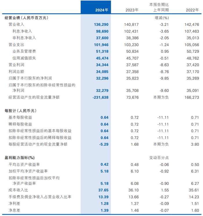 2025年3月29日,该司年报披露。这份被业内称为“王晓永首考成绩单”的年报显示:该行净利润322.96亿元,较2019年峰值腰斩近4成,创下至少近12年来最低纪录,9.85%的下滑幅度也在目前已披露年报的23家A股上市银行中垫底。