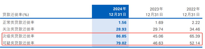 2024年,民生银行的次级贷款迁徙率、可疑类贷款迁徙率增幅很大。分别从上一年的45.06%增加至86.85%、46.63%增加至79.02%。