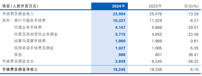 然而,非息收入方面,民生银行亦有隐忧。如上图,2024年民生银行非息净收入下滑2.05%,其中手续费及佣金净收入下降5.15%,代理保险、基金费率下调直接打击中间业务。