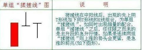 搓揉线即一根T形和一根倒T形K线的组合,就象洗衣服来回搓揉一样,在趋势途中表明主力在洗盘,经过来回的搓揉自然会洗得干净。其实,将两根线组合起来实际就是一根十字线,故在头部或底部与十字线的作用相同。搓揉线K线组合形态分几种: