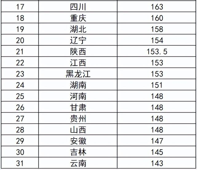 其它省份都在200元以下,比如山东188元,新疆185元,福建180元。还有7个省份在150元以下,分别是河南、贵州、甘肃、山西,都是148元,安徽147元,吉林145元,云南垫底,只有143元。