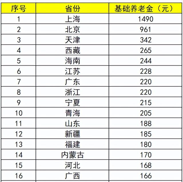 具体来看一下,上海和北京的基础养老金遥遥领先,分别是1490元,961元,就是它们大幅拉高了平均值。