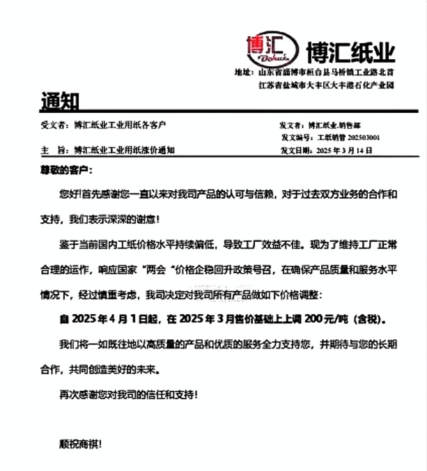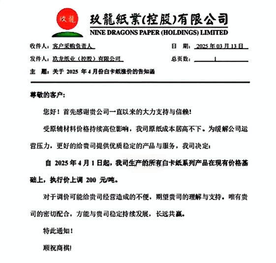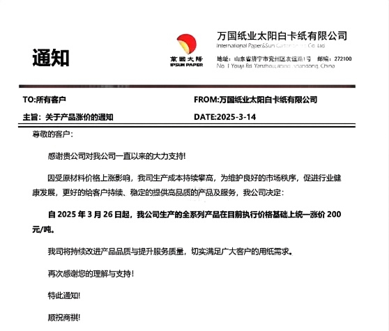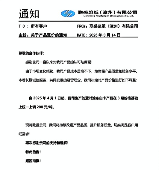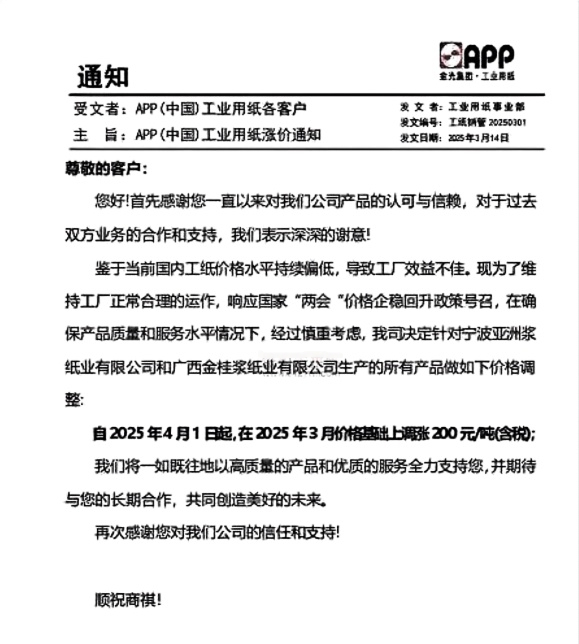 近期,纸业市场掀起涨价潮,多家行业巨头纷纷宣布上调产品价格,以应对原材料成本攀升及市场供需变化。以下是主要企业的涨价信息汇总: