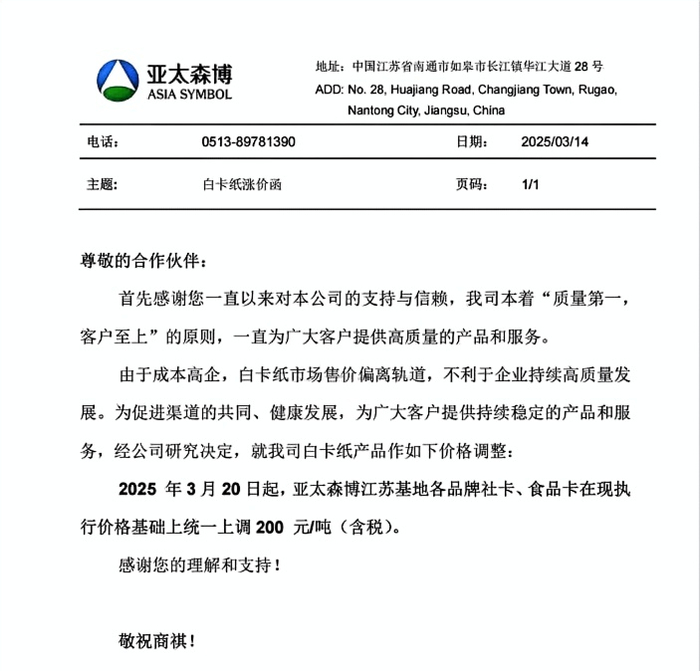涨价幅度:白卡纸产品在现执行价格基础上统一上调200元/吨(含税)。