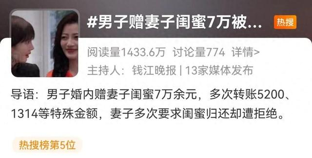 3月31日晚,“男子赠妻子闺蜜7万被判全额返还加利息”的词条,冲上热搜。