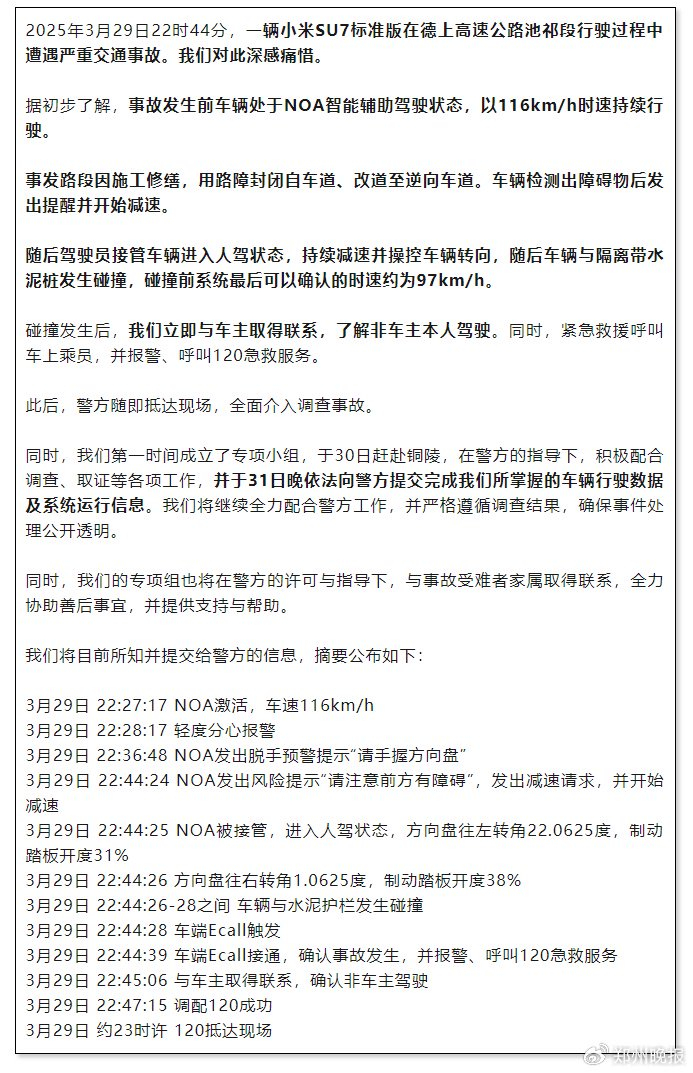 小米通报SU7高速碰撞爆燃情况