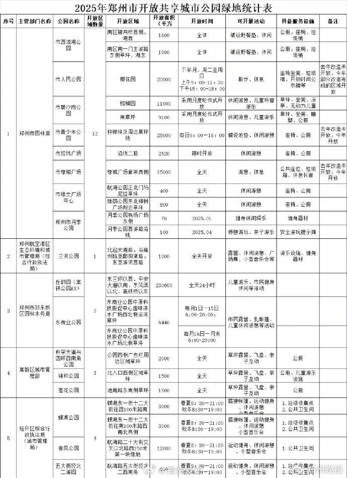 4月1日起,郑州市园林局在全市再新增对外开放绿地51处,共享面积约76万平方米。至此,全市累计开放共享绿地达267处,总面积突破922万平方米。