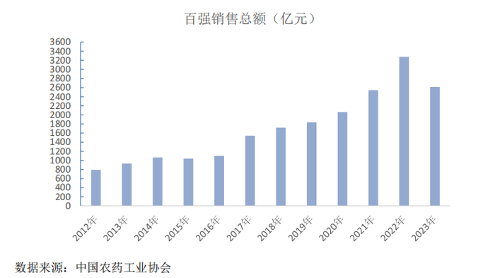 不过近年来,为解决农药滥用现象,我国亦在环保、安全等方面采取更严格的管控措施,从“十三五”的环保整治到“十四五”的减量增效,农药行业中安全隐患大、环保不达标的中小企业加速出清。与此同时,国家不断推进农药生产企业兼并重组、转型升级、做大做强,培育出一批竞争力强的大中型生产企业。根据中国农药工业协会发布的中国农药行业销售百强榜显示,前 10 强企业 2023年销售总额达 1,027.23 亿元,同比减少 21.29%,占百强销售总额 39.31%,与 2022年齐平。销售额超过 10 亿元的企业达 73 家,产业整体集中度明显提升。