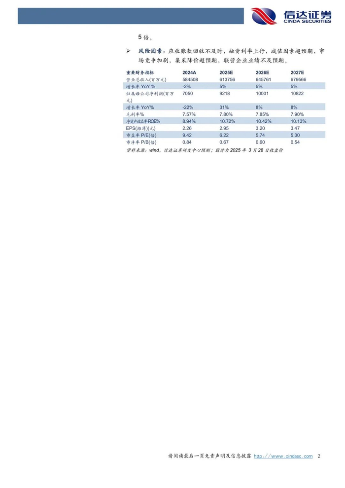 风险因素:应收账款回收不及时,融资利率上行,减值因素超预期,市场竞争加剧,集采降价超预期,联营企业业绩不及预期。