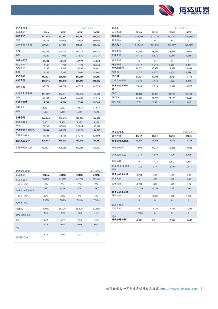 盈利预测:我们预计公司2025-2027年营业收入分别约为6137.56亿元、6457.61亿元、6795.66亿元,同比增速分别约为5%、5%、5%,实现归母净利润分别为92.18亿元、100.01亿元、108.22亿元,同比分别约增长31%、8%、8%,对应当前股价PE分别约为6倍、6倍、5倍。