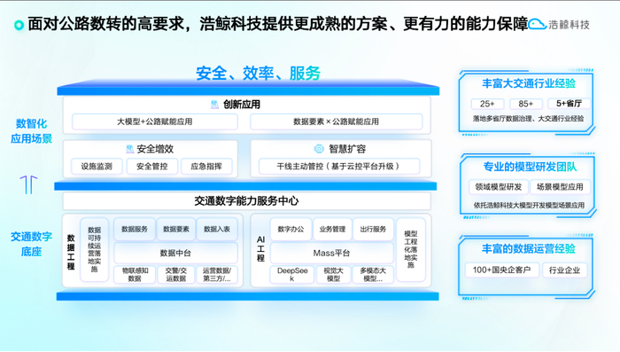 面对公路数字化转型的迫切需求,浩鲸科技充分发挥自身在数据智能、AI大模型以及大交通领域的丰富行业经验,以实际业务场景为切入点,构建“1+3”体系。“1”指的是一套数智化运营底座,依托浩鲸科技在数据治理方面的深厚经验,助力客户实现从单纯的数据建设向高效的数据运营转变,同时配备专业领域模型,进一步为业务赋能。“3”则涵盖了智慧扩容、安全增效以及创新应用三个关键方向,尤其值得一提的是,创新应用依托领域大模型,为各种场景应用注入强大动力。