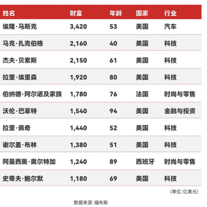 此外,榜单前10位的富豪所在领域除特斯拉划归到汽车行业外,有6人均为科技公司掌舵者,表明科技行业依旧是创造巨额财富的关键领域。