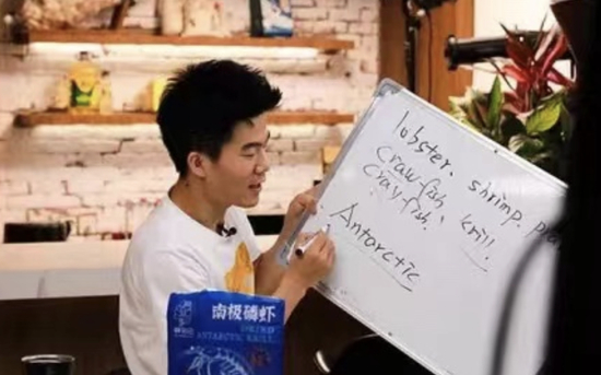 他的直播间风格多样,卖虾和葡萄时,他会用日语、韩语等四国语言去讲解;看到牛排时,他会顺势教观众许多实用的单词:牛排steak、平底锅pan,牛排原切original cut……