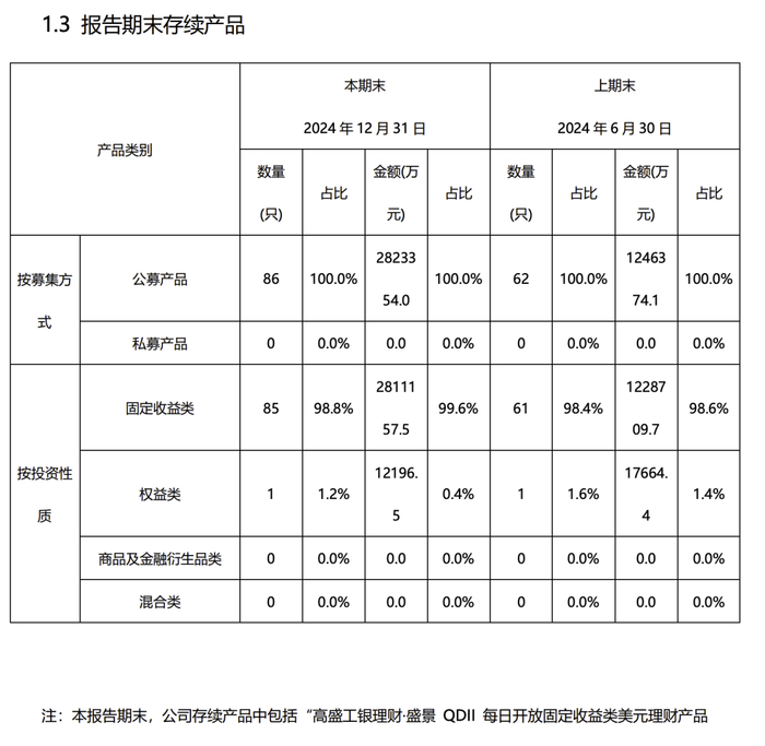 高盛工银理财成立之初即推出了QDII类产品。当时,市场波动率高企。其推出的稳健型QDII产品逐步受到投资者认可。高盛工银理财在2024年下半年理财业务报告中写道,期内公司新发行了“高盛工银理财·盛景封闭式固定收益类美元理财产品69期”等61只固定收益类产品。其中,51只固定收益类产品以美元募集。