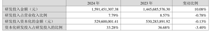 2024年全年,公司研发投入金额为15.91亿元,同比增长10.08%;研发投入占营业收入比例为7.79%,相比上年同期下降0.78个百分点。此外,公司全年研发投入资本化率为33.28%。