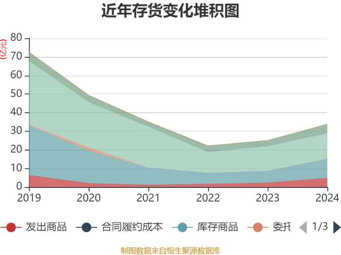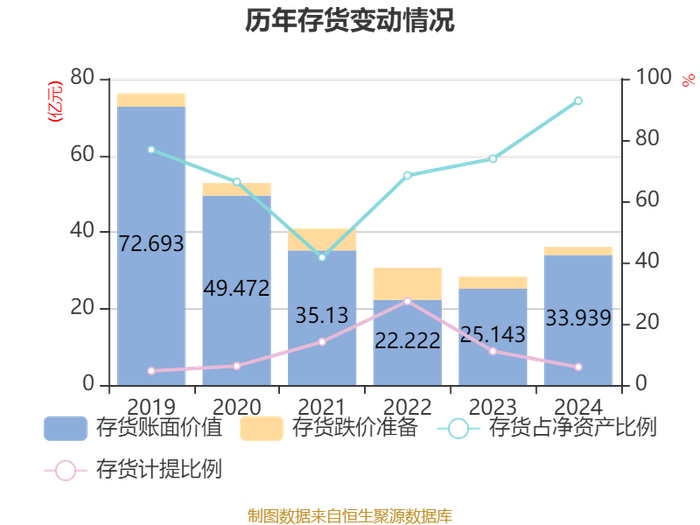 从存货变动来看,截至2024年末,公司存货账面价值为33.94亿元,占净资产的92.8%,较上年末增加8.8亿元。其中,存货跌价准备为2.12亿元,计提比例为5.87%。