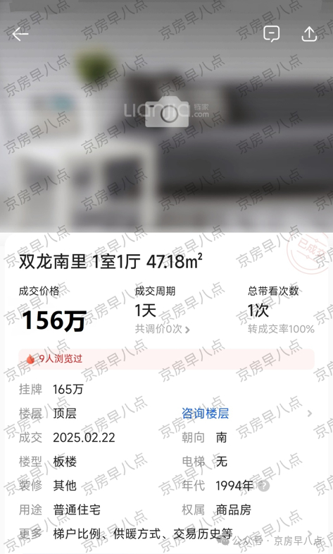 双龙南里在2025年2月成交了一套一居室,成交价是156万,成交单价是3.3万/平。