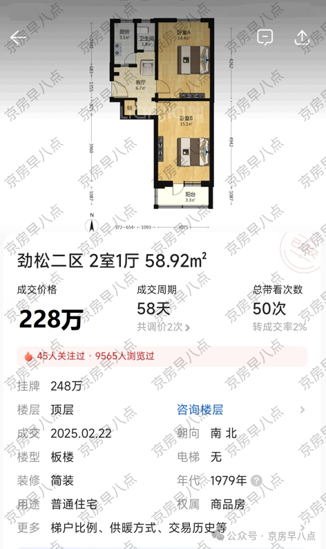 劲松二区在2025年2月成交了一套两居室,成交价是228万,成交单价是3.8万/平。