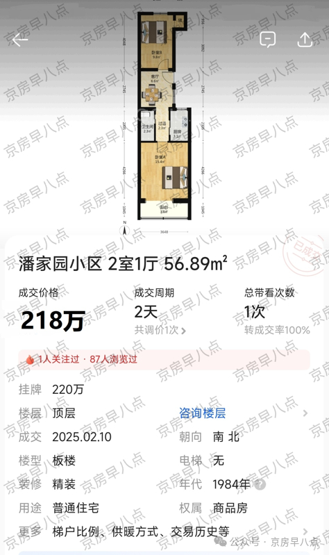 潘家园小区在2025年2月成交了一套两居室,成交价是218万,成交单价是3.8万/平。