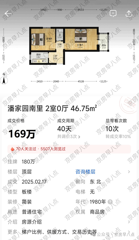潘家园南里在2025年2月成交了一套两居室,成交价是169万,成交单价是3.6万/平。